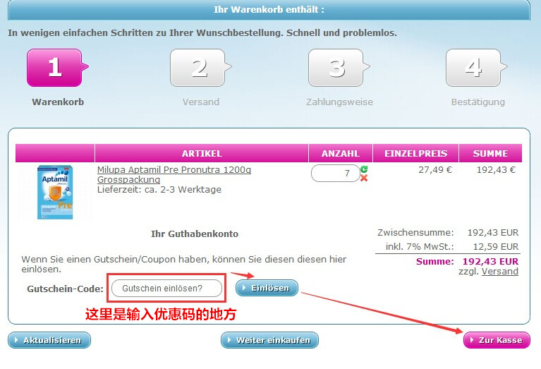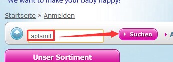 1、选择商品购买,现在就以aptamil奶粉为例:可以直接在搜索栏内输入aptamil,点击【Suchen】进行搜索: